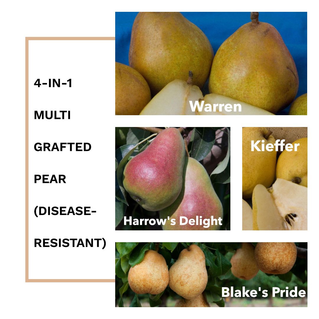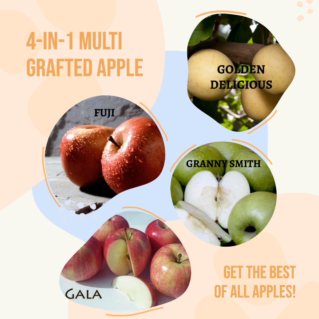 4-in-1 trees (apple, pear, pluot, peach, cherry)